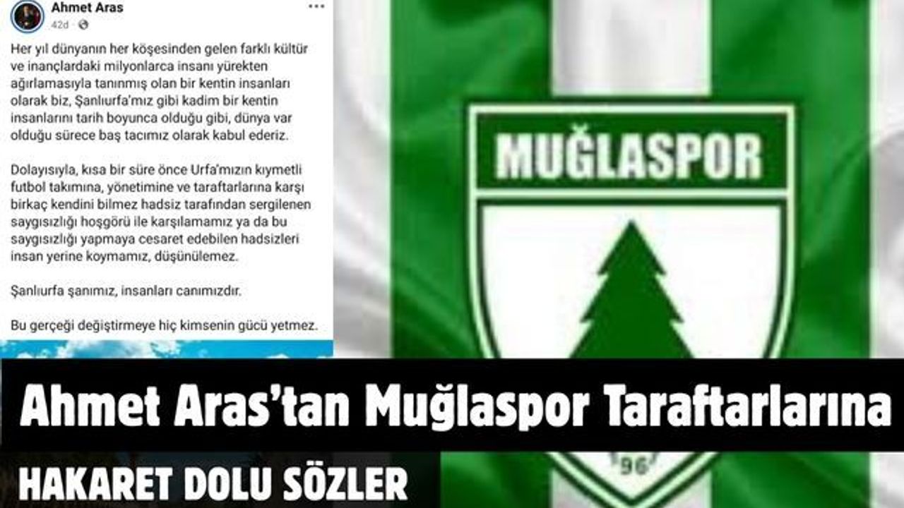 Muğla Büyükşehir Belediye Başkanı Ahmet Aras, geçtiğimiz günlerde TFF 2. Lig Beyaz Grup'ta oynanan Muğlaspor – Şanlıurfaspor maçının ardından yaşanan arbedeyle ilgili Muğlaspor taraftarını suçladı. Aras, sosyal medyadan yaptığı açıklamasında Muğlaspor taraftarlarına hakarete varan söylemlerde bulunarak “Urfamızın kıymetli futbol takımına, yönetimine, taraftarına karşı birkaç kendini bilmez hadsiz tarafından sergilenen saygısızlığı hoşgörüyle karşılamamız ya da bu saygısızlığı yapmaya cesaret edebilen hadsizleri insan yerine koymamız düşünülemez” ifadelerini kullandı.