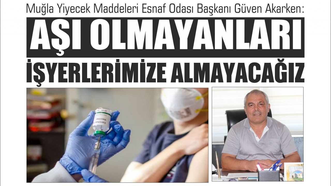 Aşı olmayanlara kaşı geniş kapsamlı kısıtlama getirilmesini dile getiren Muğla Yiyecek Maddeleri Esnaf Odası başkanı Güven Akarken, “Kahveciler, fırıncılar, lokantacılar başta olmak üzere Covid-19 salgını döneminden ve kısıtlamalar sürecinde en çok etkilenen sektörlerin başındalar. Dolayısıyla Eylül-Ekim Ayı itibariyle nasıl bir sistem geliştirirler mi bilinmez ama tanımlama gibi olur muhtemelen. Vatandaşlara HES kodu gibi aşı sorulması gerekiyor. Aşı olmayanları kesinlikle bu tür yerlere alınmaması gerekiyor. Aşı olmayanları işletmelerimize aldığımız zaman ödüllendirmiş oluyoruz” şeklinde konuştu.