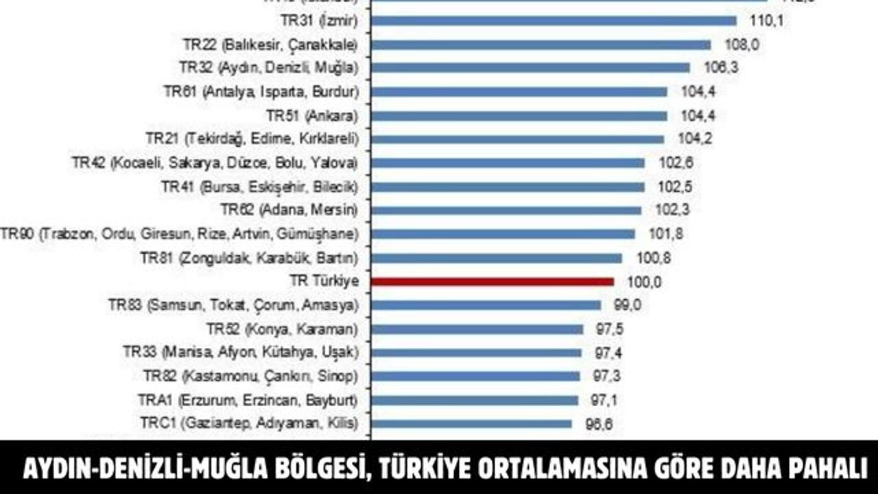 İstatistiki Bölge Birimleri Sınıflaması (İBBS) 2. Düzey esas alınarak hazırlanan çalışmada, ortak bir mal ve hizmet sepeti üzerinden bölgesel fiyat düzeyleri hesaplandı. Endeks değerinin 100'ün üzerinde olması, ilgili bölgenin Türkiye ortalamasına kıyasla daha pahalı olduğunu gösteriyor.