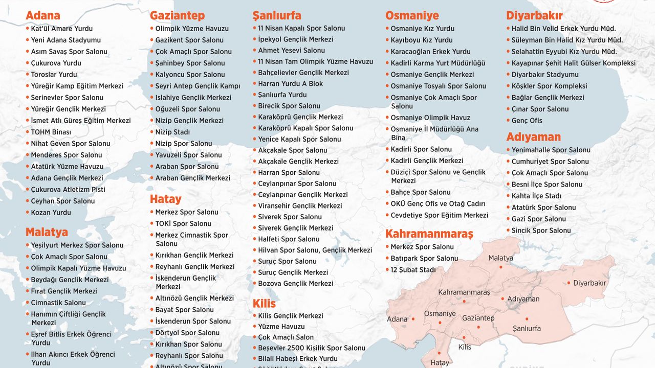 "Hatay Merkez Spor Salonu TOKİ Spor Salonu Merkez Cimnastik Spor Salonu Kırıkhan Gençlik Merkezi Reyhanlı Gençlik Merkezi İskenderun Gençlik Merkezi Altınözü Gençlik Merkezi Bayat Spor Salonu İskenderun Spor Salonu Dörtyol Spor Salonu Kırıkhan Spor Salonu Reyhanlı Spor Salonu Altınözü Spor Salonu - Gaziantep Şehit Kamil: Olimpik Yüzme Havuzu Gazikent Spor Salonu Çok Amaçlı Spor Salonu Şahinbey: Şahinbey Spor Salonu Kalyoncu Spor Salonu Seyri Antep Gençlik Kampı Islahiye: Islahiye Gençlik Merkezi Oğuzeli: Oğuzeli Spor Salonu Nizip: Nizip Gençlik Merkezi Nizip Stadı Nizip Spor Salonu Yavuzeli: Yavuzeli Spor Salonu Araban: Araban Spor Salonu Araban Gençlik Merkezi - Şanlıurfa Haliliye: 11 Nisan Kapalı Spor Salonu İpekyol Gençlik Merkezi Ahmet Yesevi Salonu 11 Nisan Tam Olimpik Yüzme Havuzu Bahçelievler Gençlik Merkezi Harran Yurdu A Blok Şanlıurfa Yurdu Birecik: Birecik Spor Salonu Karaköprü: Karaköprü Gençlik Merkezi Karaköprü Kapalı Spor Salonu Eyyübiye: Yenice Kapalı Spor Salonu Akçakale: Akçakale Spor Salonu Akçakale Gençlik Merkezi Harran: Harran Spor Salonu - Kilis: Kilis Gençlik Merkezi Yüzme Havuzu Çok Amaçlı Salon Beşevler 2500 Kişilik Spor Salonu Bilali Habeşi Erkek Yurdu Söğütlüdere Semt Sahası 7 Aralık Semt Sahası - Adana Sarıçam: Kat'ül Amare Yurdu Yeni Adana Stadyumu Asım Savaş Spor Salonu Çukurova Yurdu Toroslar Yurdu Yüreğir: Yüreğir Kamp Eğitim Merkezi Serinevler Spor Salonu Yüreğir Gençlik Merkezi İsmet Atlı Güreş Eğitim Merkezi TOHM Binası Seyhan: Nihat Geven Spor Salonu Menderes Spor Salonu Atatürk Yüzme Havuzu Çukurova: Adana Gençlik Merkezi Çukurova Atletizm Pisti Ceyhan: Ceyhan Spor Salonu Kozan: Kozan Yurdu - Diyarbakır Halid Bin Velid Erkek Yurdu Müdürlüğü Süleyman Bin Halid Kız Yurdu Müdürlüğü Selahattin Eyyubi Kız Yurdu Müdürlüğü Kayapınar Şehit Halit Gülser Spor Kompleksi Diyarbakır Stadyumu Köşkler Spor Kompleksi Bağlar Gençlik Merkezi Çınar Spor Salonu Genç Ofis - Malatya Yeşilyurt: Merkez Spor Salonu Çok Amaçlı Spor Salonu Olimpik Kapalı Yüzme Havuzu Beydağı Gençlik Merkezi Battalgazi: Fırat Gençlik Merkezi Cimnastik Salonu Hanımın Çiftliği Gençlik Merkezi Eşref Bitlis Erkek Öğrenci Yurdu İlhan Akıncı Erkek Öğrenci Yurdu Battalgazi Kız Öğrenci Yurdu - Osmaniye: Osmaniye Kız Yurdu Kayıboyu Kız Yurdu Karacaoğlan Erkek Yurdu Kadirli Karma Yurt Müdürlüğü Osmaniye Gençlik Merkezi Osmaniye Tosyalı Spor Salonu Osmaniye Çok Amaçlı Spor Salonu Osmaniye Olimpik Havuz Osmaniye İl Müdürlüğü Ana Bina Kadirli Spor Salonu Kadirli Gençlik Merkezi Düziçi Spor Salonu ve Gençlik Merkezi Bahçe Spor Salonu OKÜ Genç Ofis ve Otağ Çadırı Cevdetiye Spor Eğitim Merkezi"
