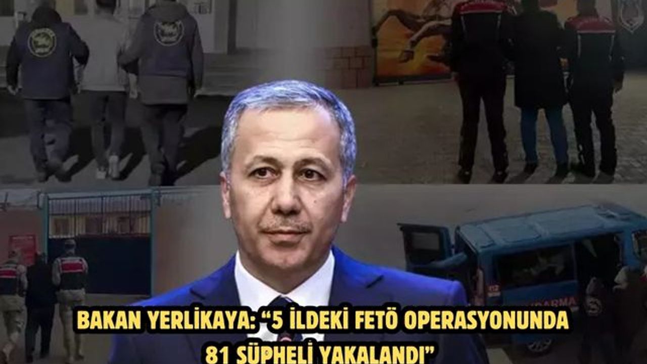 İçişleri Bakanı Yerlikaya, sosyal medya hesabından yaptığı açıklamada, İstanbul, Ankara, İzmir, Diyarbakır ve Balıkesir merkezli FETÖ'ye yönelik bu sabah eş zamanlı olarak düzenlenen operasyonlarda; aktif kamu görevlilerinin de içerisinde olduğu 81 şüphelinin yakalandığını belirterek şu bilgileri verdi: