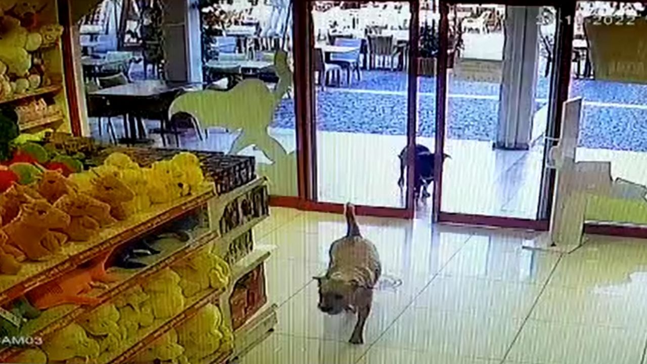 Güvenlik kamerasının kayıtlarında, bir alışveriş merkezindeki oyuncakçıya giren iki köpekten biri, etrafı izledikten sonra pelüş oyuncak köpeği ağzına alarak mağazadan çıkması yer aldı. Bu iki köpeğin mağaza kapısında bekleyen diğer köpeklerle birlikte bölgeden uzaklaştığı görüldü.