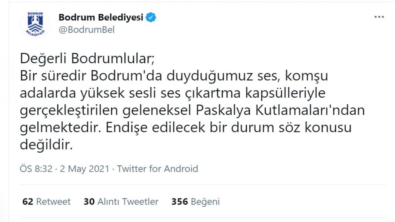 Bodrum’da akşam saatlerinde duyulan patlama sesleri paniğe neden oldu. Kentin çeşitli noktalarından gelen sesler ilçede gerginlik yarattı.Patlamalarla ilgili Bodrum Belediyesi açıklama yaptı.Belediye, Bodrum’a yakın adalarda, Paskalya kutlamaları kapsamında atılan ses kapsüllerinden kaynaklandığını açıkladı.Belediyenin sosyal medya hesabından yapılan açıklamada şu ifadelere yer verildi: “ Değerli Bodrumlular; Bir süredir Bodrum'da duyduğumuz ses, komşu adalarda yüksek sesli ses çıkartma kapsülleriyle gerçekleştirilen geleneksel Paskalya Kutlamaları'ndan gelmektedir. Endişe edilecek bir durum söz konusu değildir.”