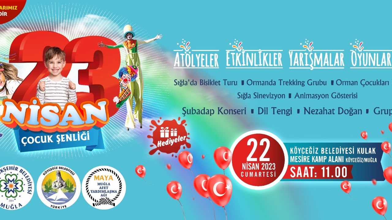 Muğla Büyükşehir Belediyesi’nin 22 Nisan 2023 tarihinde Köyceğiz’de düzenleyeceği 23 Nisan Çocuk Şenliği’nde Sığla’da bisiklet turu, ormanda trekking grubu, orman çocukları etkinliği, sığla sinevizyon, animasyon gösterileri yapılacak ve Şubadap Grubu, Dil Tengi, Nezahat Doğan, Grup Sığla etkinlikte sahne alacak. Atölyeler, etkinlikler, yarışmalar, oyunlarla renklenecek 23 Nisan etkinliğinde çocuklar için çeşitli sürprizler ve hediyeler de olacak.