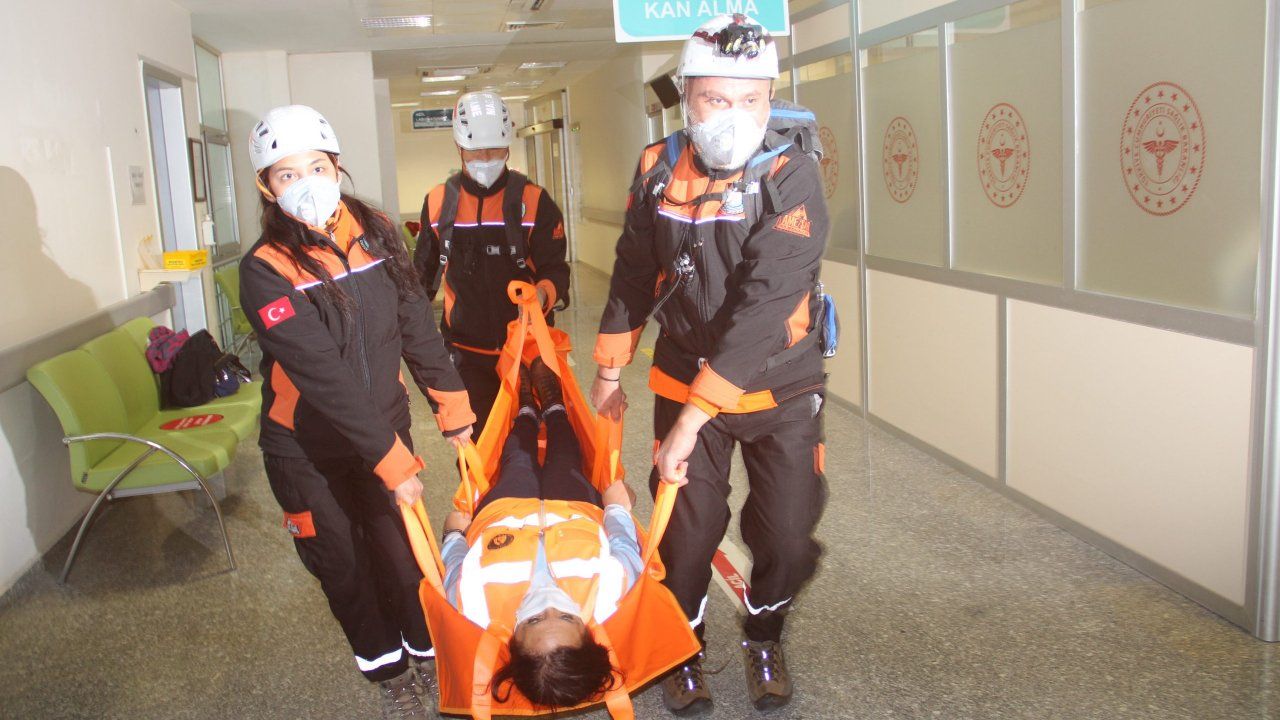 AFAD, Mahalle Afet Gönüllüleri Acil Müdahale (MAG AME/SAR) ekibi, polis, itfaiye ve hastane personeli iş birliğinde düzenlenen tatbikatta, senaryo gereği hastane koridorlarına duman bırakıldı.