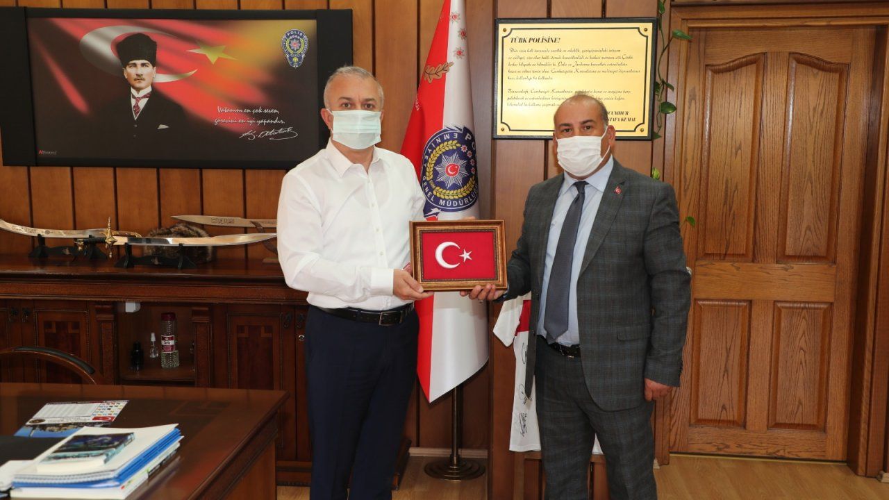 Bölge Başkanı Erhan Sayın, ziyaret kapsamında emniyet müdür ve müdür yardımcılarına ipek kumaş üzerine nakışlı Türk bayrağı ve ipek kumaşa baskılı Mustafa Kemal Atatürk hediye etti.