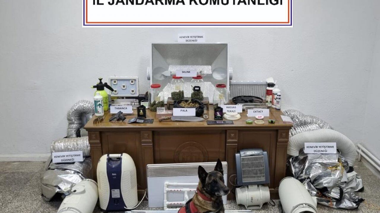 Yapılan aramada; çok miktarda skunk, 10 kök kenevir, 1 adet hassas terazi, 10 adet extacy hap, 7 adet yurtdışı menşeili özel üretim skunk tohumu, 15 gr kenevir tohumu, 1 adet esrar öğütme aparatı, 79 parçadan oluşan kenevir üretmek için kullanılan iklimlendirme ve ışık sistemi, 950 ml sıvı gübre, 2 lt PH sıvı, 1 adet 7,65 mm ruhsatsız tabanca, 31 adet 7.65 mm fişek, 14 adet 9 mm fişek ve 1 adet pala ele geçirildi.
