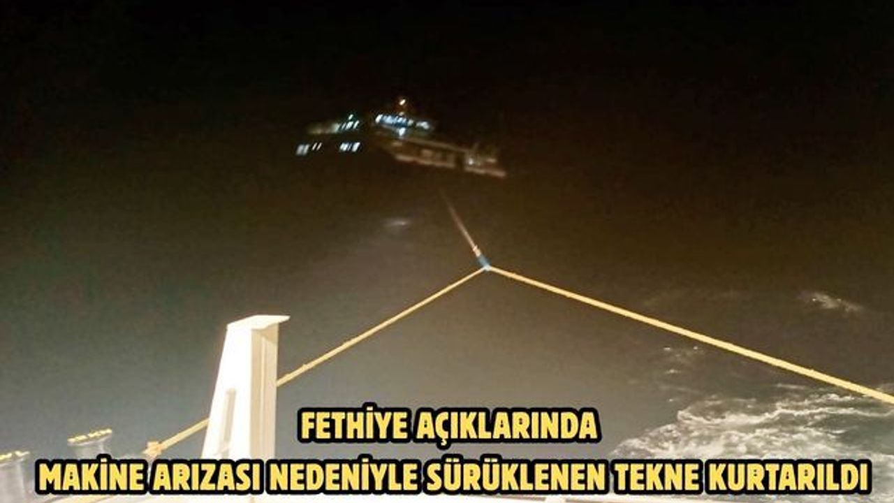 Fethiye açıklarında seyir halinde iken makine arızası nedeniyle sürüklenen, içerisinde 5 kişi bulunan 31 metre boyundaki tekne, KIYEM-5 hızlı tahlisiye (can kurtarma) botuna yedeklenerek Fethiye Koyu’nda emniyete alındı.