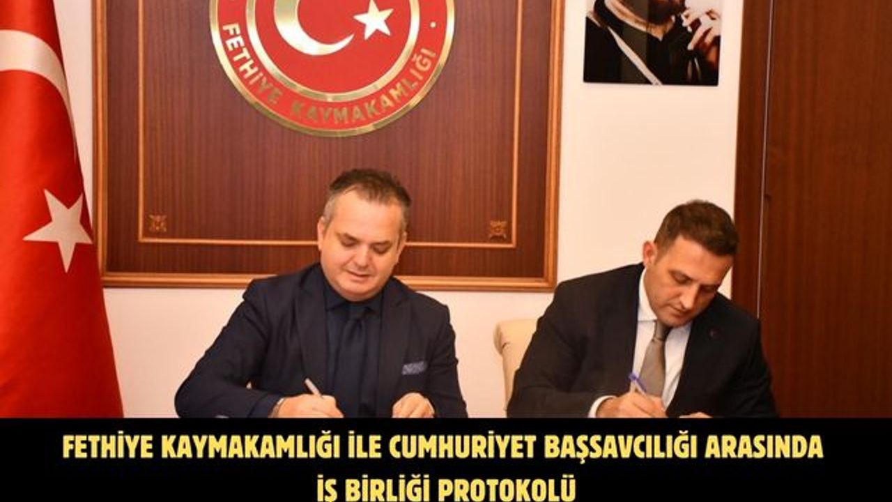 Yükümlülerin ücretsiz kamu hizmeti kapsamında Kaymakamlık birimlerinde çalıştırılması için iş birliği protokolü, Kaymakam Fatih Akkaya ile Fethiye Cumhuriyet Başsavcısı Günşafak Karartı tarafından imzalandı.