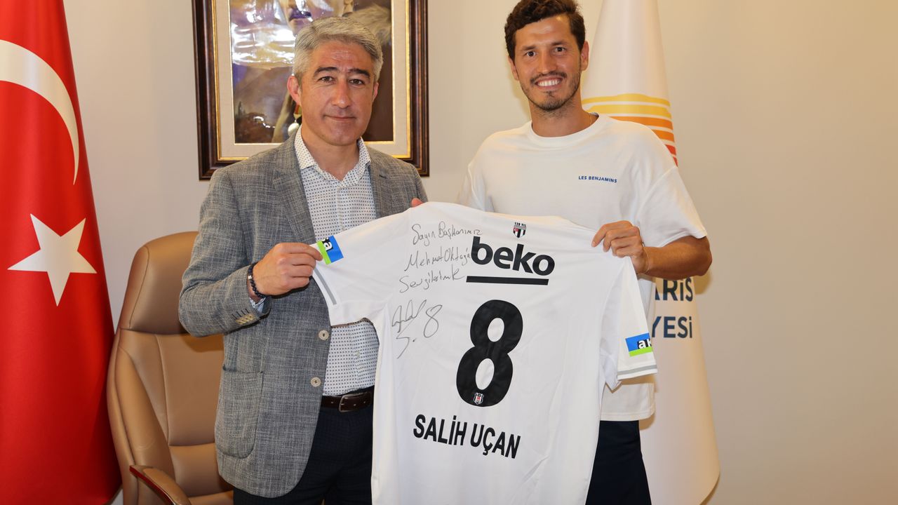 Milli takım kampından dönen Marmarisli futbolcu Salih Uçan ayağının tozuyla Belediye Başkanı Mehmet Oktay’ı ziyaret etti. Marmaris Belediyesi Gençlik Spor Kulübü altyapısından yetişerek Fenerbahçe ve Beşiktaş forması giyen, yurt dışında da ülkemizi başarıyla temsil eden ve Milli Takım’a da seçilenUçan’a ziyaretinde Marmaris Belediyesi Gençlikspor Kulübü Başkanı Hasan Yaylalı da eşlik etti. Başarılı futbolcunun ziyaretinden duyduğu mutluluğu dile getiren Başkan Oktay “Salih kardeşimiz Beşiktaş ve Milli Takım forması altında oynadığı futbolla hepimizin göğsünü kabartıyor. Ahde vefa örneği göstererek her zaman bizlere de destek oluyor. Spor hayatında bundan böyle de daha büyük başarılara imza atacağına eminim” ifadelerini kullandı. Salih Uçan Belediye Başkanı Oktay’a imzalı Beşiktaş forması hediye ederken, ziyaret fotoğraf çekimiyle son buldu.