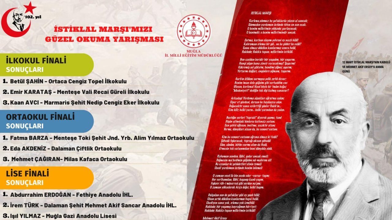 Muğla İl Milli Eğitim Müdürlüğü tarafından 12 Mart İstiklal Marşı'nın Kabulü ve Mehmet Akif Ersoy'u Anma Günü etkinlikleri kapsamında, il genelindeki okullarda "İstiklal Marşı'nı Güzel Okuma Yarışması" düzenlendi. 13 İlçede tamamlanan ilçe finallerinin ardından Menteşe Halk Eğitimi Merkezi konferans salonunda gerçekleştirilen il finalinde; ilkokul, ortaokul ve lise kategorisinde yarışan öğrencilerden komisyon üyelerinin puanlamasıyla dereceye giren isimler belirlendi.