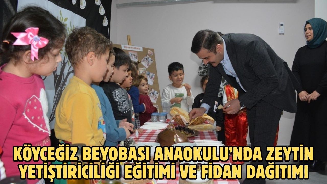 Köyceğiz Kaymakamı Mert Kumcu, İlçe Milli Eğitim Müdürü Taner Şen, Köyceğiz İlçe Tarım ve Orman Müdürü Eşref Arslan ve Beyobası Muhtarı Naid Sül ile birlikte Beyobası Anaokulu’nda, Milli Eğitim Bakanlığı "Enerji Dostu Mavi Yeşil Okullar" programı ve Türkiye Çevre Eğitim Vakfı (TÜRÇEV) "Eko-Okullar Projesi" kapsamında, İlçe Tarım ve Orman Müdürlüğü iş birliğiyle ziraat mühendisi Hulisi Atasoy tarafından 25 kız, 25 erkek öğrenci, 5 öğretmen ve velilere yönelik zeytin yetiştiriciliği ile zeytin hastalık ve zararlıları konusunda verilen eğitime katıldı. Öğrencilerin, okulun zeytin bahçesinden topladıkları zeytinlerle hazırladıkları ürünleri ve kendi yaptıkları ekmeklerle oluşturdukları 'Zeytin Tadım Atölyesi'ni ve geri dönüşüm ve sanat atölyesi çalışmalarını ziyaret eden Kaymakam Kumcu, Köyceğiz Orman İşletme Müdürlüğü iş birliğiyle temin edilen zeytin fidanlarını eğitime katılan velilere hediye etti.