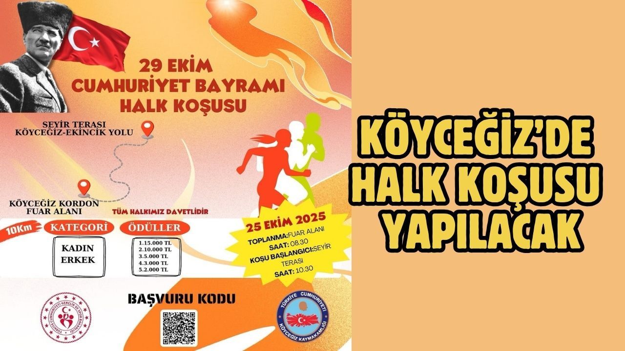 29 Ekim Cumhuriyet Bayramı halk koşusuna katılacak sporcular 25 Ekim 2025 tarihinde Köyceğiz Atatürk Kordonu Fuar Alanı’nda saat 08.30’da toplanacak. Sporcular koşu başlangıç noktası olan Köyceğiz Ekincik Yolu Seyir Terası’na taşınacak. 29 Ekim Cumhuriyet Bayramı halk koşusu saat 10.30’da Köyceğiz Ekincik Yolu Seyir Terası’ndan başlayacak, Köyceğiz Atatürk Kordonu Fuar Alanı’nda sona erecek. 10 Km’lik 29 Ekim Cumhuriyet Bayramı halk koşusunda para ödülü verilecek. Kadın ve Erkek kategorilerinde dereceye giren sporculara ödülleri takdim edilecek. Katılım için afişte yer alan başvuru koduna veya başvuru linkine tıklayarak başvuru yapılabilecek. Köyceğiz Kaymakamlığı tarafından 29 Ekim Cumhuriyet Bayramı halk koşusuna, Cumhuriyetin coşkusunu yaşamak için tüm halk davet edildi.