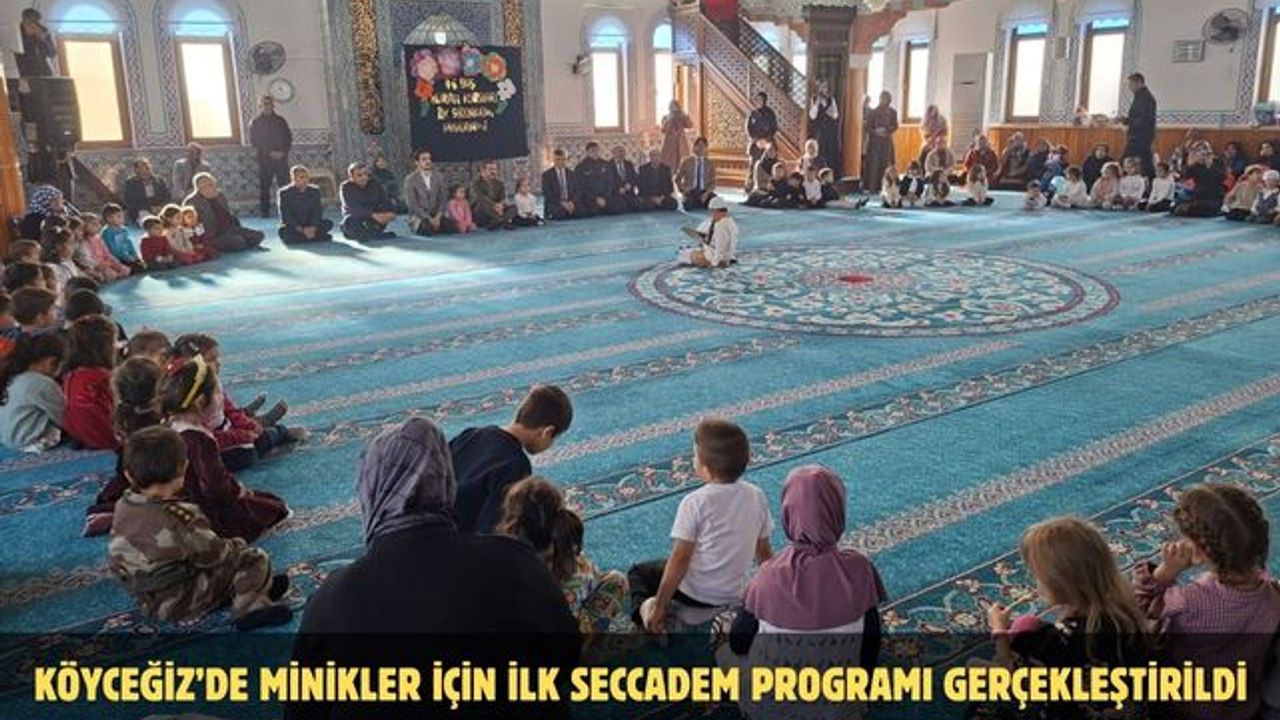 Köyceğiz Kaymakamı Mert Kumcu’nun himayelerinde, Köyceğiz İlçe Müftülüğüne bağlı 4-6 yaş Kur’an Kurslarında eğitim-öğretime devam eden minik öğrenciler için ilk seccadem programı gerçekleştirildi. Toparlar Merkez Camii'nde yapılan ilk seccadem programında Köyceğiz Kaymakamı Mert Kumcu ve Köyceğiz İlçe Müftüsü Ahmet Karagöz programla ilgili konuşmalarını yaparak hayırlı olsun temennilerinde bulundu. Kur’an Kursuna devam eden öğrenciler tarafından Kuran okunup, ilahiler söylendi. Program sonunda öğrencilere kendi isimlerinin yazılı olduğu seccadeler Köyceğiz Kaymakamı Mert Kumcu ve protokol üyeleri tarafından takdim edildi. İlk seccadem programına yoğun katılımın olduğu görüldü.