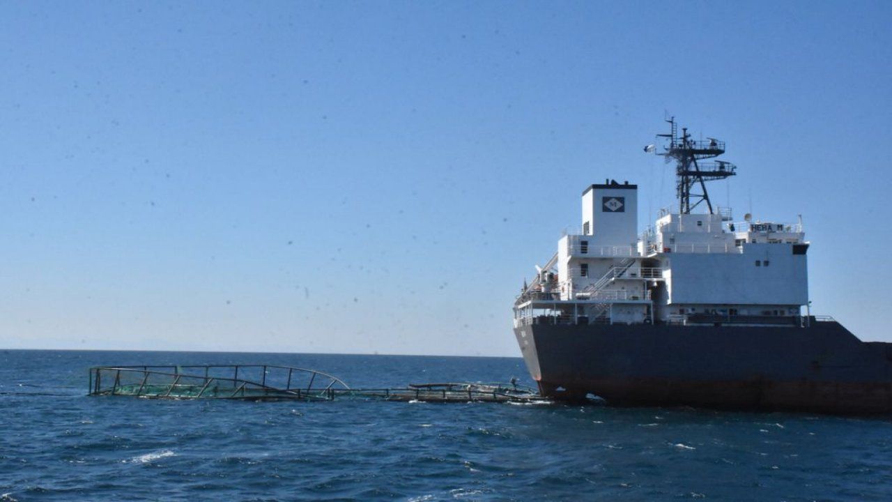 Milas’ın kırsal mahallelerindeki ocaklardan çıkarılan feldspat madeninin yurt dışına ihracının yapıldığı Güllük Limanı'na yanaşmak isteyen bir kuru yük gemisi, körfezde konuşlu balık üretim çiftliğindeki havuzlara çarptı.