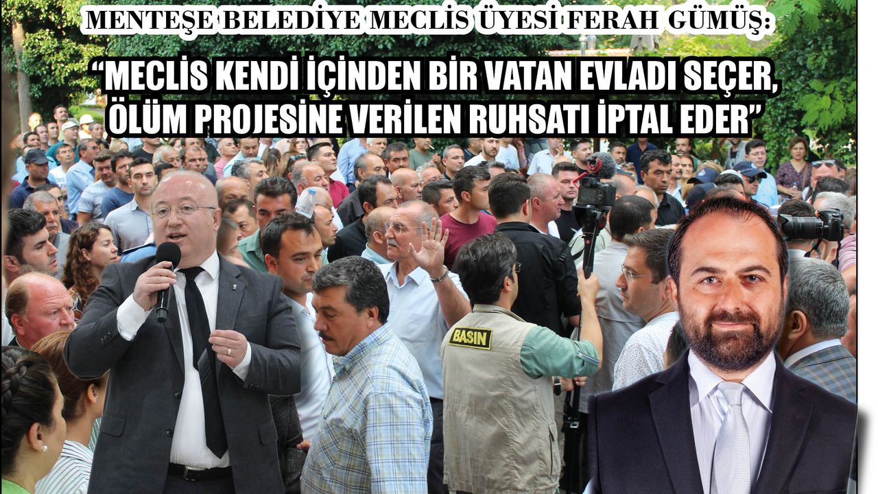 Menteşe Belediye Meclis Üyesi Ferah Gümüş, Menteşe Belediye Başkanı Bahattin Gümüş’ü istifaya davet ederek, “Meclis kendi içinden, toprağını, havasını, suyunu savunacak bir vatan evladı seçer ve oy birliği ile Muğla'nın ölüm projesine verilen ruhsatı iptal eder” dedi.