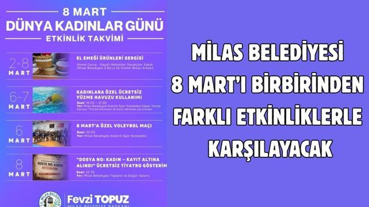 Dolu dolu bir 8 Mart programı hazırlayan Milas Belediyesi tarafından belediye bünyesinde bulunan havuz ücretsiz olarak kadınların kullanımına açılırken, voleybol maçı, tiyatro ve kadın el emeği ürünleri sergisi gerçekleştirilecek.