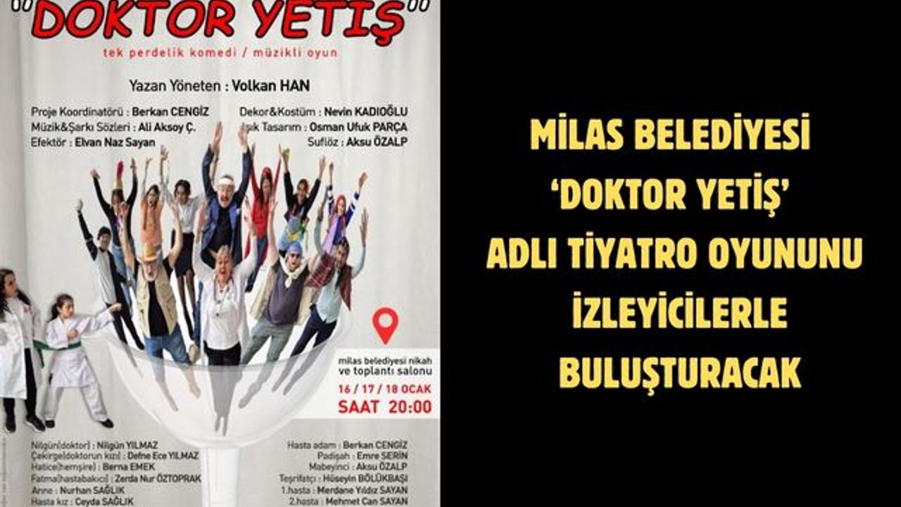 Milas’ın kültürel dinamizmini artırmayı ve her yaştan vatandaşı tiyatronun büyülü dünyasıyla buluşturmayı hedefleyen Milas Belediyesi ‘Doktor Yetiş’ adlı oyunu tiyatroseverlerin beğenisine sunacak.