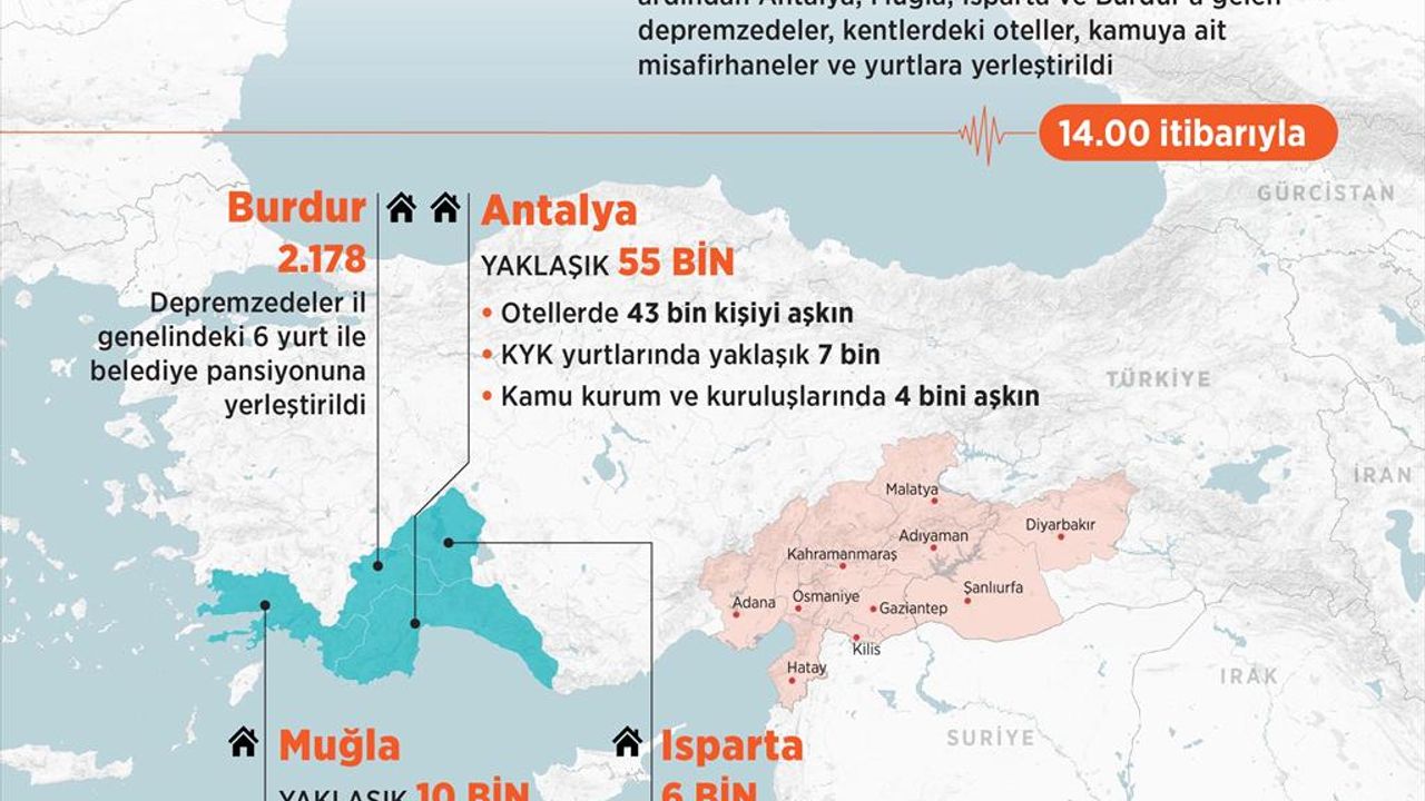 Muğla Valiliği ve AFAD koordinesinde kente getirilenlerle kendi imkanlarıyla gelen depremzede sayısı 10 bine ulaştı. Depremzedeler çoğunlukla Bodrum, Marmaris ve Fethiye gibi turizm merkezlerindeki otellere yerleştirildi. Afetzedelerin bir kısmı da diğer ilçelerdeki otel, kamu misafirhaneleri ve KYK yurtlarına yönlendirildi.