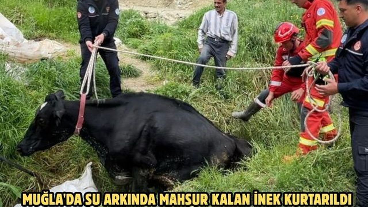 İnek, bölgeye ulaşan itfaiye ekibinin müdahalesiyle mahsur kaldığı yerden kurtarıldı.