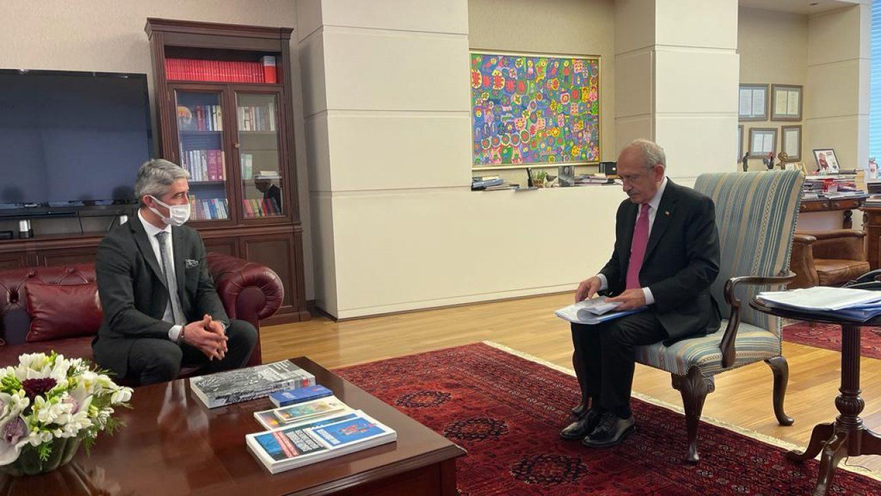 Marmaris Belediye Başkanı Mehmet Oktay, CHP Genel Başkanı Kemal Kılıçdaroğlu’nu ziyaret etti. CHP Genel Merkezi’nde gerçekleşen ziyarette Oktay, belediye faaliyetleri ile ilgili bilgilendirmede bulundu. Yapılan çalışmalarla ilgili hazırlanan raporu Genel Başkan Kılıçdaroğlu’na sunan Başkan Oktay özellikle son aylardaki sel ve diğer doğal afetlerdeki çalışmalar başta olmak üzere yapılan faaliyetleri anlatı.