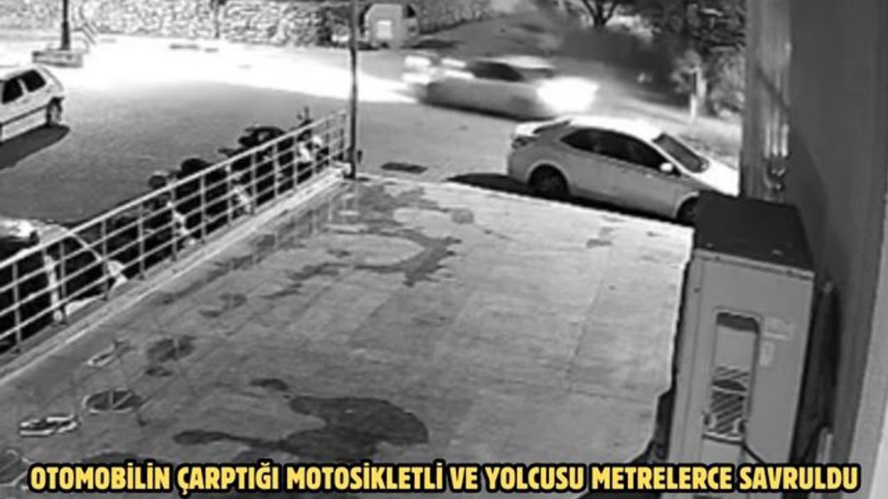 Öte yandan kaza anı, bölgedeki güvenlik kameralarına anbean yansıdı. Görüntülerde otomobil sürücüsünün hızla geldiği ve önünde seyreden motosiklet sürücüsüne çarptığı, çarpışmanın etkisiyle sürücü ve yolcunun savrularak sürüklenmesi yer aldı.
