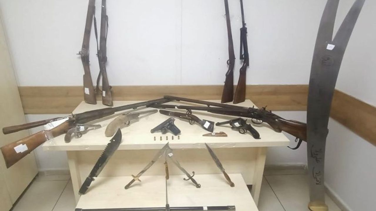 Yapılan arama sonucu; 1 adet 7.65 mm. ruhsatsız tabanca, 2 adet toplu ruhsatsız tabanca, 2 adet ağızdan dolma karabarut ile çalışan ruhsatsız tabanca, 1 adet şarjör, 5 adet 7.65 mm. fişek, 8 adet ruhsatsız av tüfeği, 8 adet çeşitli ölçülerde bıçak ve kılıç, 1 adet baston görünümlü kesici alet ele geçirildi.