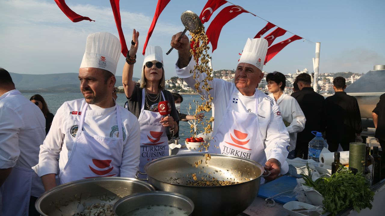 Şef Özlem Mekik'in sunumuyla gerçekleştirilen "yemek şov"da, Aregala Türkiye Sınır Tanımayan Şefler Derneğinden Ahmet Çetin, Kadri Memiş ve Adnan Şentürk, deniz ürünleri ile zeytinyağı kullanarak meze ve yemekler yaptı.
